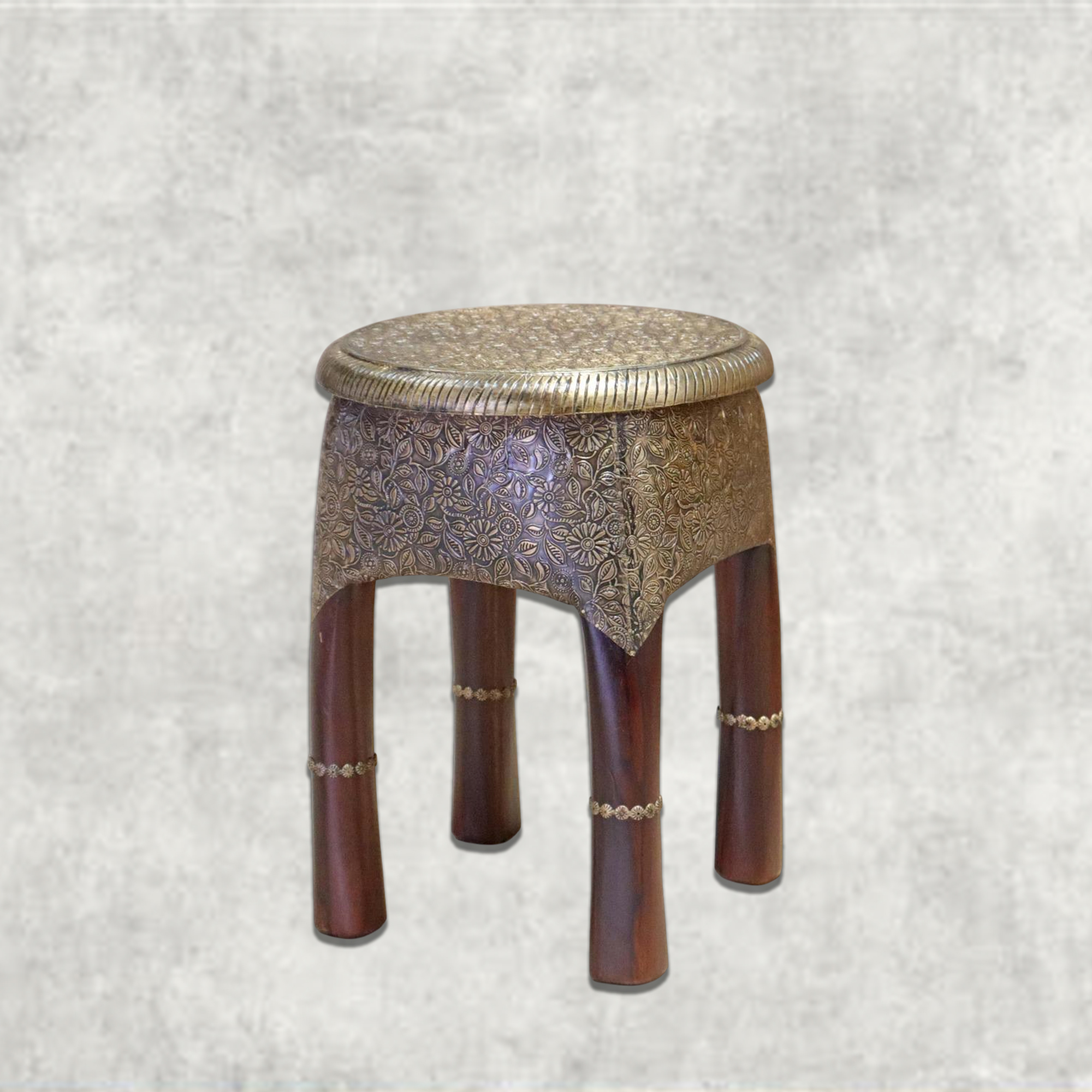 Elevate your décor with this Antique Brass-Embossed Wooden Stool, a stunning fusion of traditional artistry and functional design. The seat and upper structure are adorned with intricate hand-embossed brass floral patterns, giving the stool a luxurious vintage character. The rich wooden legs, accented with delicate brass rings, create a graceful contrast and enhance its regal charm.