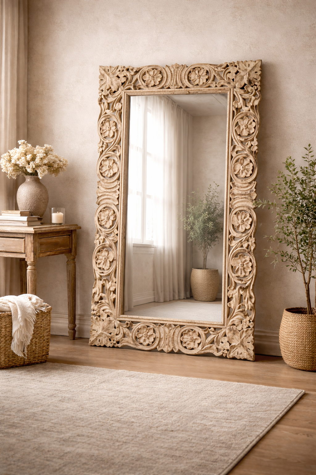 This monumental hand-carved frame is a masterwork of architectural grandeur and sculptural precision, meticulously shaped from premium solid wood. Measuring 150 x 90 cm , its commanding silhouette features a distinctive arched inner border lined with rhythmic, pointed “Kangura” detailing, inspired by the majestic gateway portals of traditional Indian forts and palaces. It serves as a breathtaking floor-length statement piece for grand entryways, master suites, or luxury dressing areas, bringing a sense of historic permanence and royal opulence to the home.