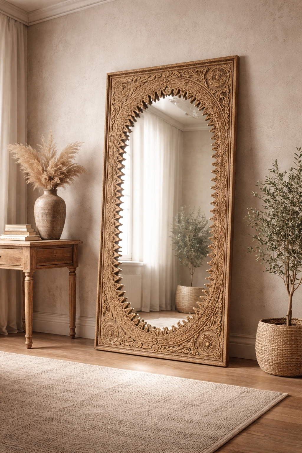 This monumental hand-carved frame is a masterwork of architectural grandeur and sculptural precision, meticulously shaped from premium solid wood. Measuring 120 x 90 cm , its commanding silhouette features a distinctive arched inner border lined with rhythmic, pointed “Kangura” detailing, inspired by the majestic gateway portals of traditional Indian forts and palaces. It serves as a breathtaking floor-length statement piece for grand entryways, master suites, or luxury dressing areas, bringing a sense of historic permanence and royal opulence to the home.