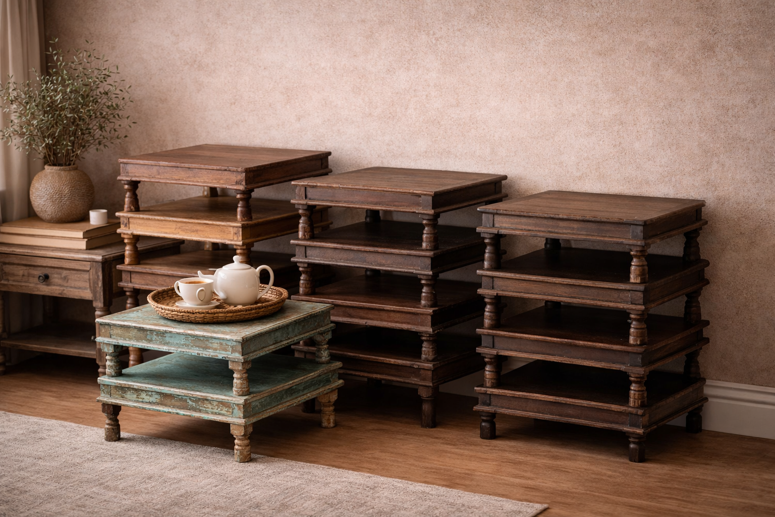 This exquisite low-profile pedestal is a masterwork of functional art and sculptural precision, meticulously hand-carved from a single block of premium solid wood. Inspired by the traditional Choki (ceremonial stool) used in Indian heritage homes, its distinctive silhouette serves as a majestic platform for ritual altars, luxury vanity displays, or as a sophisticated riser for your marble kundi collections. The Choki is defined by its rhythmic, high-relief floral carvings and geometric patterns that wrap around its sturdy, tapered legs and side panels, creating a rich tactile appeal.