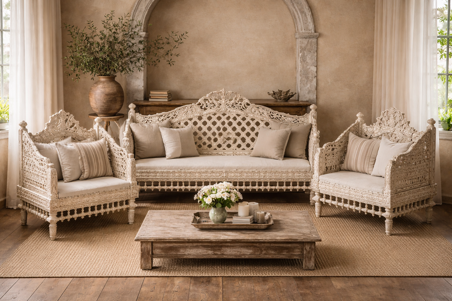 This magnificent three-seater sofa set is a handcrafted statement piece, crafted from premium solid timber. Standing at a functional height of 90 cm, it serves as a commanding anchor for grand living rooms, lounges, or sophisticated reception areas. The design features a broad, hand-finished backrest and a richly detailed frame adorned with multiple layers of intricate hand-carved floral scrolls, geometric patterns, and traditional architectural motifs, finished in a seasoned patina that is finished in a warm, timeworn patina.