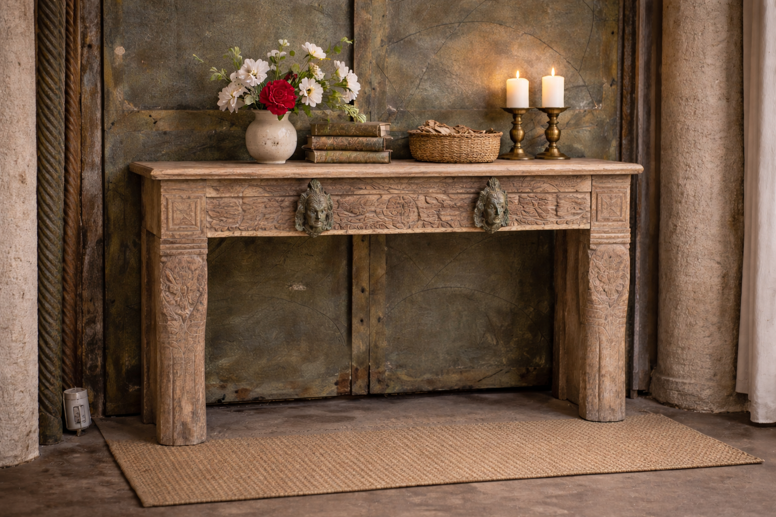 This monumental handcrafted console is a handcrafted statement piece, crafted from premium solid timber. Standing at a functional height of 92 cm, it serves as a commanding anchor for grand entryways, hallways, or sophisticated living spaces. The design features a broad, hand-finished top surface and a richly detailed façade adorned with multiple layers of intricate hand-carved floral scrolls, geometric patterns, and traditional architectural motifs, finished in a seasoned patina that is finished in a warm, timeworn patina.