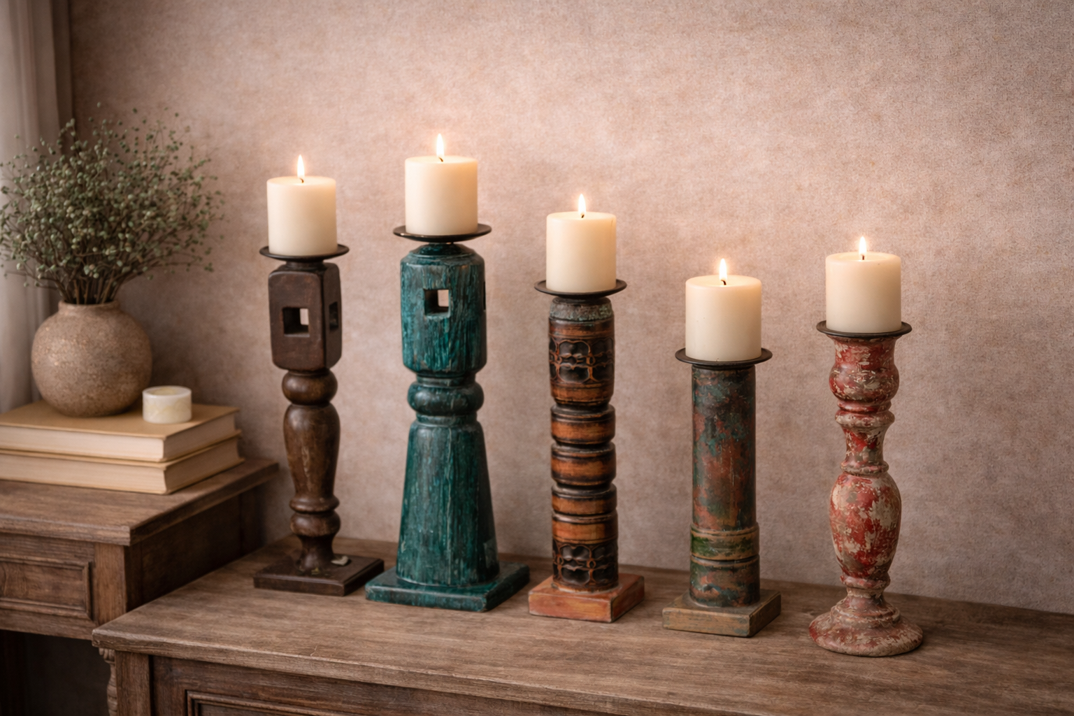This breathtaking candle stand is a masterwork of sculptural depth and architectural elegance, meticulously hand-carved from a single block of premium solid wood. Its commanding silhouette is inspired by the ornate pillars and rhythmic geometry found in traditional Indian palace interiors. It serves as a sophisticated pedestal for pillar candles or tea lights, bringing a sense of historic permanence and a warm, atmospheric glow to grand consoles, dining tables, or serene vanity displays.