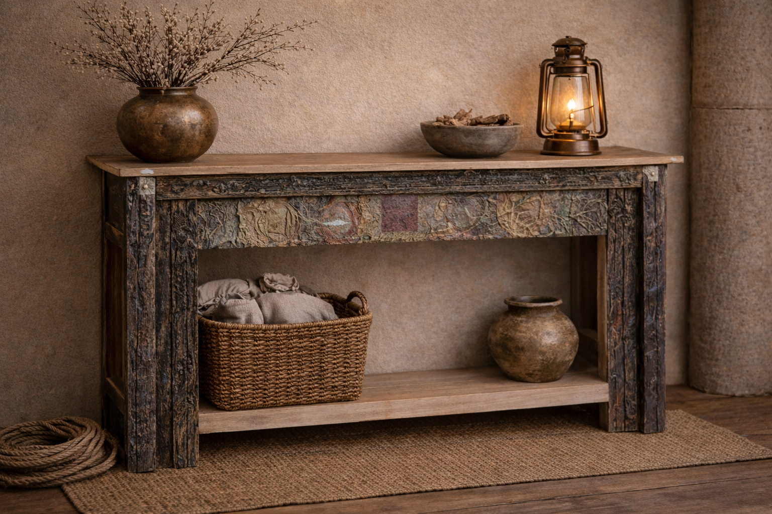 The console is defined by its robust construction, featuring traditional joinery and reinforced architectural lines, notably visible in the thick-cut frame and the integrated lower shelving. Its balanced proportions and expansive 160 cm width provide a sense of grounded permanence, while the natural durability of the timber ensures it serves as a long-lasting centerpiece for the home. Whether used to display a curated collection of artifacts or as a standalone statement piece, this console seamlessly integrates the soul of heritage design with modern functional living.