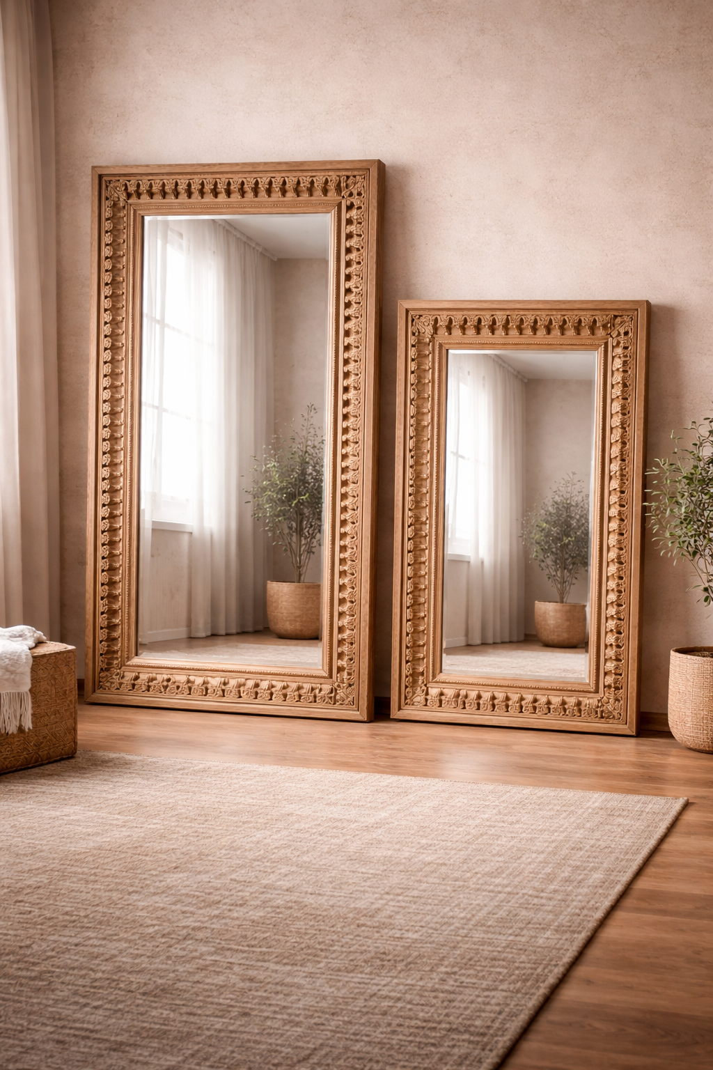 This monumental hand-carved frame is a masterwork of architectural grandeur and sculptural precision, meticulously shaped from premium solid wood. Measuring 120 x 90 cm, its commanding silhouette features a distinctive inner border lined with rhythmic, pointed “Kangura” or crenelated detailing, inspired by the majestic Jharokha windows and gateway portals of traditional Indian forts and palaces. It serves as a breathtaking floor-length statement piece for grand entryways, master suites, or luxury dressing areas, bringing a sense of historic permanence and royal opulence to the home.