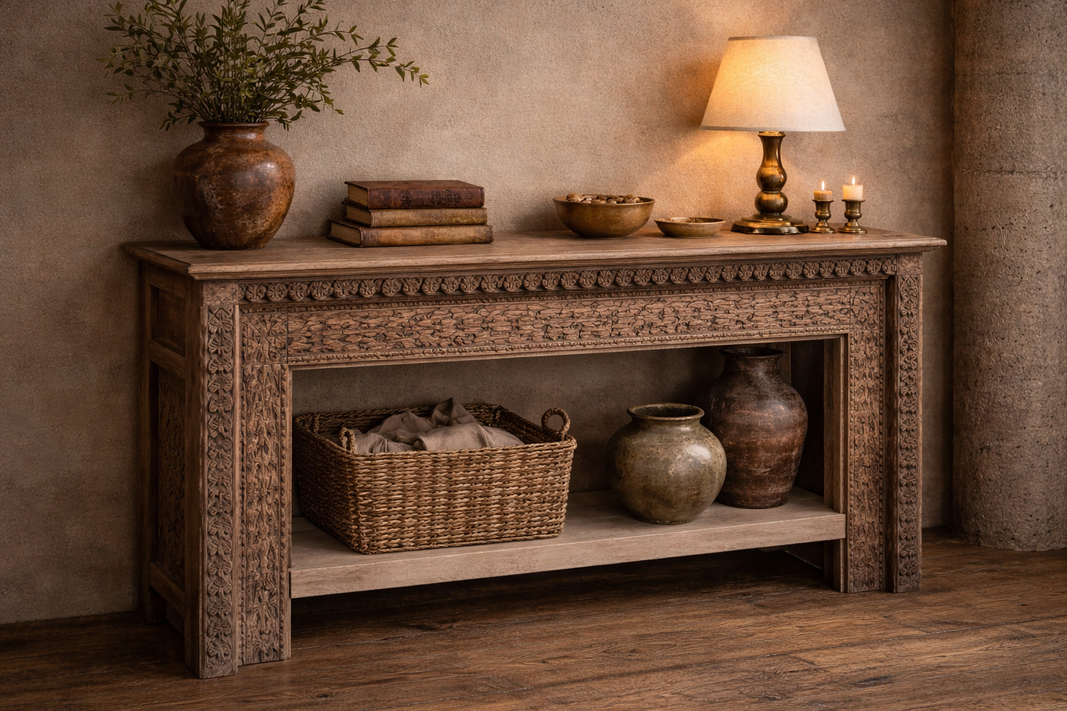 This monumental handcrafted console is a handcrafted statement piece, crafted from premium solid timber. Standing at a functional height of 92 cm, it serves as a commanding anchor for grand entryways, hallways, or sophisticated living spaces. The design features a broad, hand-finished top surface and a richly detailed façade adorned with multiple layers of intricate hand-carved floral scrolls, geometric patterns, and traditional architectural motifs, finished in a seasoned patina that is finished in a warm, timeworn patina.