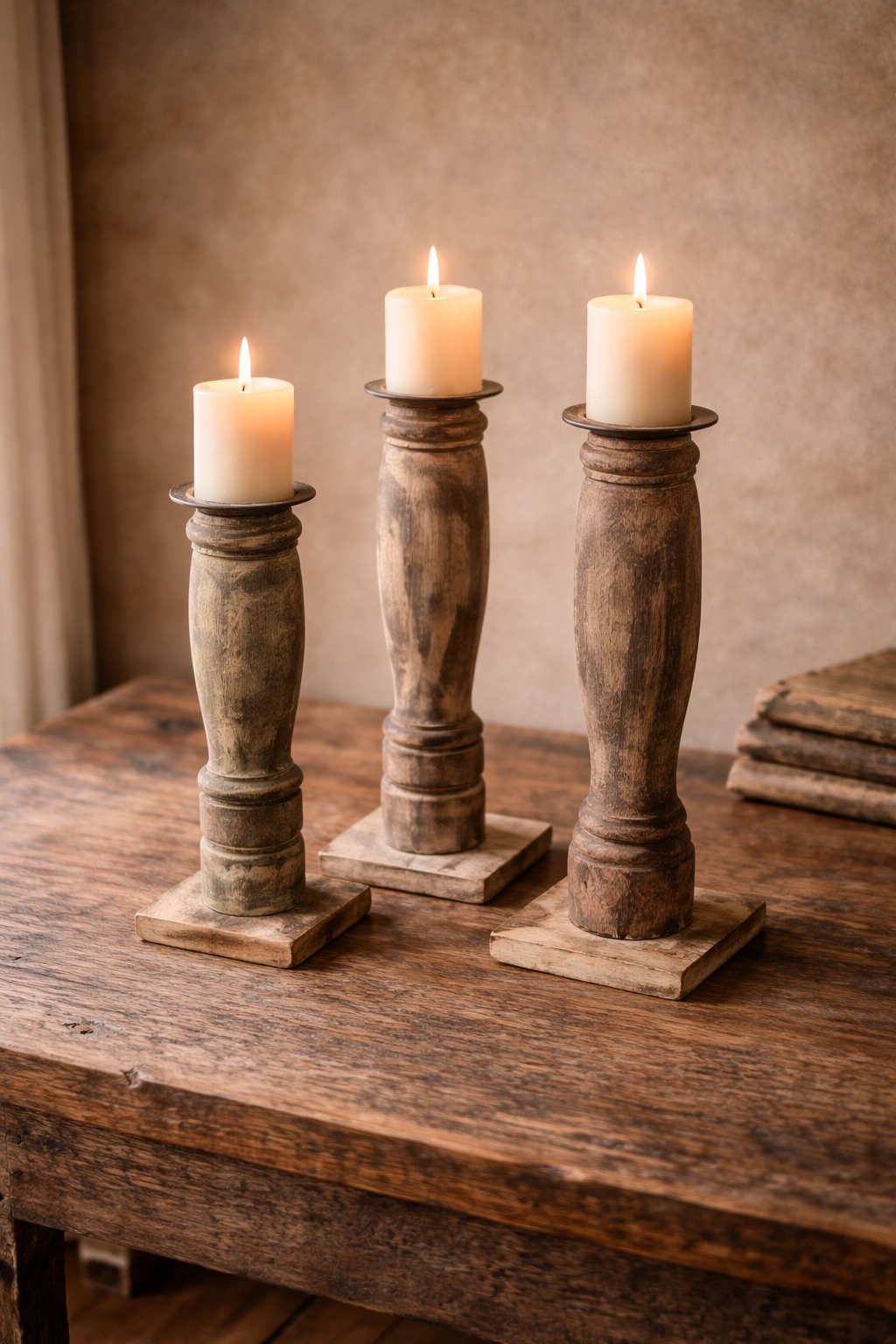 This slender hand-carved candle stand is a handcrafted statement piece, crafted from premium solid timber. Standing at a versatile height of 33 cm, it serves as a sophisticated accent piece for dining tables, bedside consoles, or curated shelving. The design features a beautifully turned, architectural body that displays hand-carved, textured surfaces and traditional moldings, finished in a seasoned patina that is finished in a warm, timeworn patina.