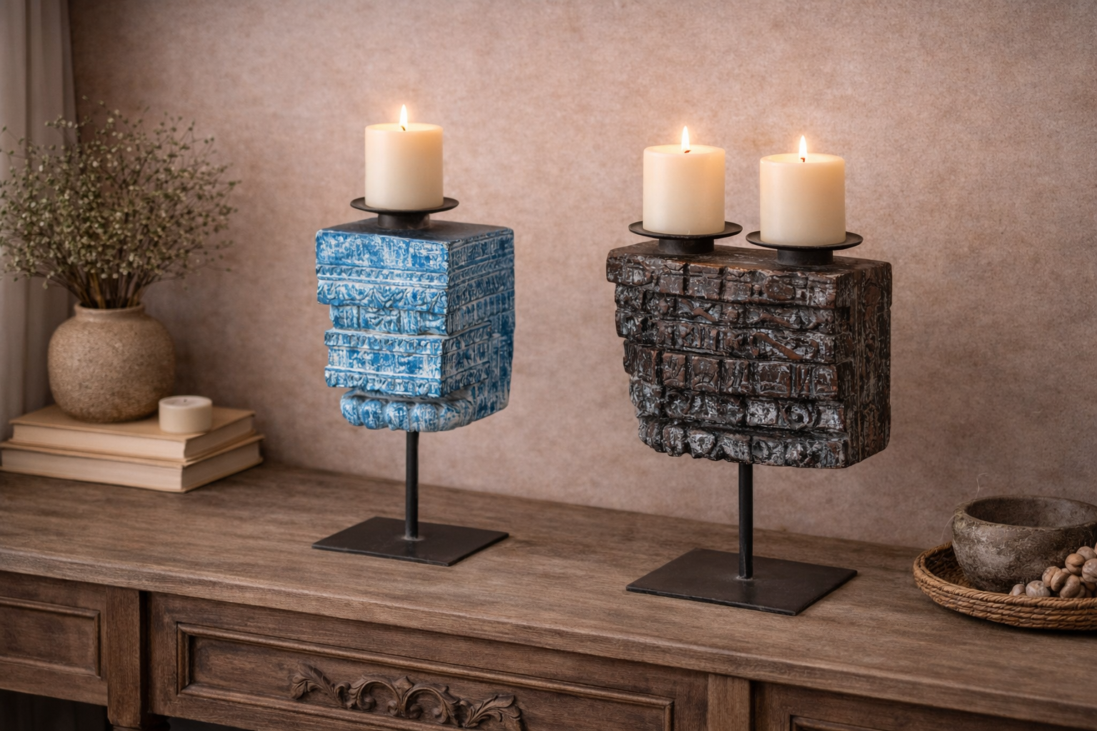 This striking candle stand is a masterwork of tribal aesthetics and sculptural precision, meticulously hand-carved to honor the unique architectural and textile heritage of the Toda people. Its commanding silhouette is defined by the iconic “Toda” arch and rhythmic geometric engravings, reminiscent of the intricate embroidery and hut motifs found in the Nilgiri highlands. It serves as a sophisticated, singular statement piece for housing a pillar candle, bringing a sense of ancient permanence and cultural depth to your mantle, console, or ritual space.