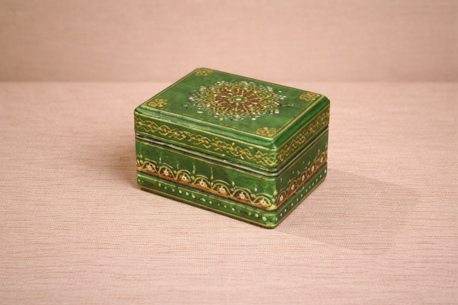 This compact hand-carved box is a handcrafted statement piece, crafted from premium solid timber. Stretching to a versatile length of 13 cm, it serves as a sophisticated storage solution for small jewelry, cherished keepsakes, or as a refined accent piece for bedside consoles and study desks. The design features a beautifully structured body that displays hand-carved, textured surfaces with intricate traditional geometric motifs, finished in a seasoned patina that is finished in a warm, timeworn patina.