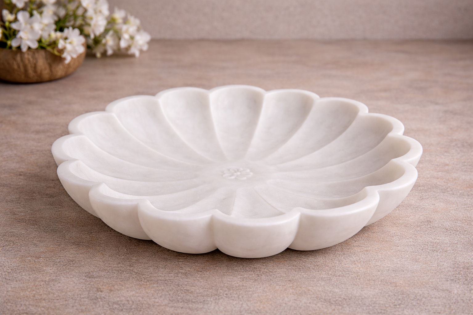 It serves as a sophisticated, petite vessel for displaying delicate flower petals or as a serene centerpiece for a single floating tea light within its elegantly scalloped interior. The bowl is defined by its rhythmic, radiating “Patti” (leaf-like) fluting that flows seamlessly from the center to the undulating petal-edged rim, creating a sense of structured movement and rich tactile appeal. The pristine white stone features a smooth, honed finish that highlights the natural crystalline purity and subtle translucency of the marble.