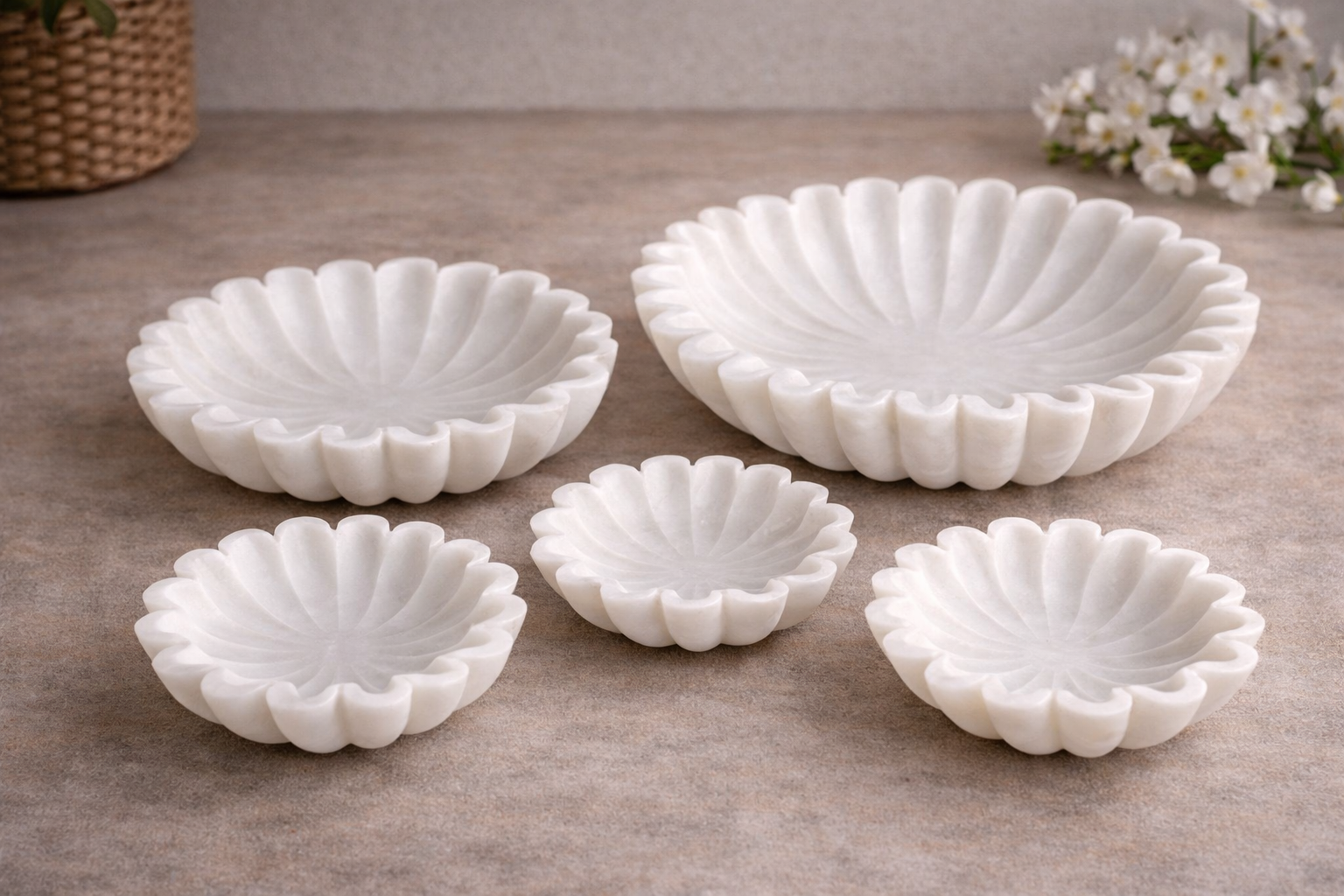 This breathtaking hand-carved vessel is a masterwork of radial symmetry and sculptural depth, meticulously shaped from a single block of premium white marble. Measuring 8 cm in diameter, its distinctive “Lehriya” (wave-like) fluted silhouette is inspired by the rhythmic undulating patterns found in traditional Indian architecture and stone craft. It serves as a sophisticated, petite vessel for displaying delicate flower petals or as a serene centerpiece for a single floating tea light within its elegantly scalloped interior.