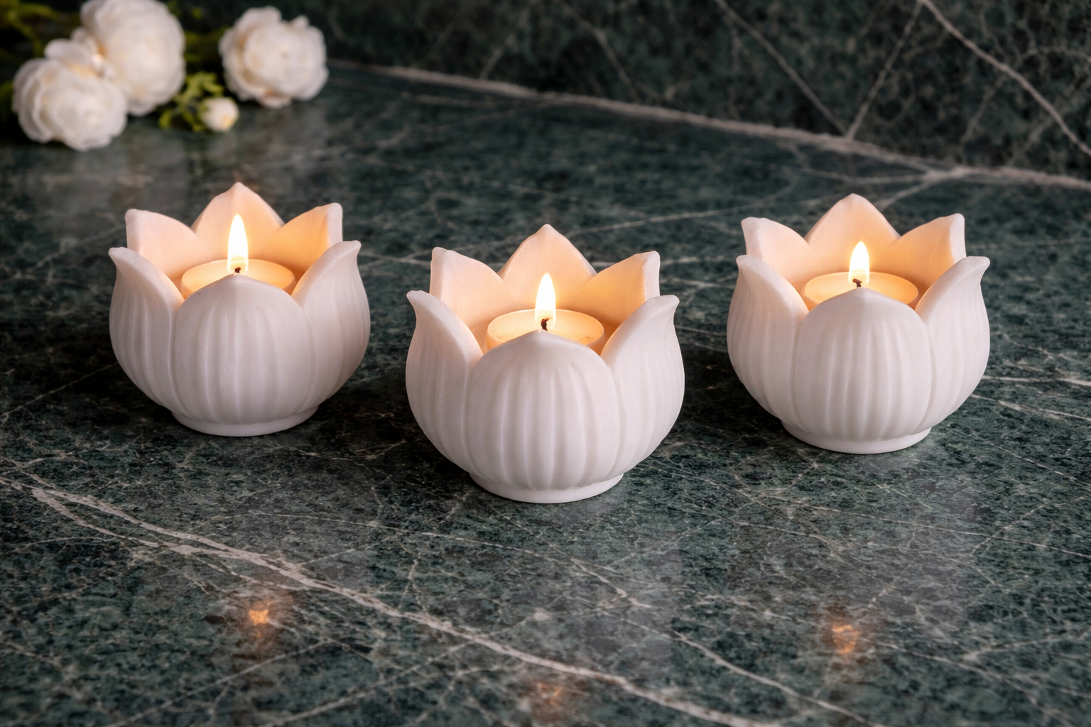 This exquisite hand-carved candle stand is a masterwork of floral elegance and sculptural depth, meticulously shaped from a single block of premium white marble. Measuring 5 cms in all dimensions, its distinctive “Lotus” silhouette is inspired by the sacred symbol of purity and enlightenment in traditional Indian art. It serves as a sophisticated, petite vessel for housing small tea lights, casting a soft, ethereal glow through its elegantly tapered marble petals.
