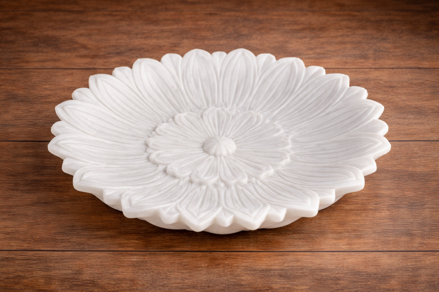 This exquisite hand-carved vessel is a masterpiece of symmetrical design and ethereal elegance, meticulously sculpted from a single block of premium white marble. Spanning a generous 15 cm in diameter, its scalloped floral silhouette is inspired by the sacred lotus motifs found in historical Indian architecture. It serves as a sophisticated vessel for floating flower petals, aromatic oils, or as a refined standalone accent for meditation spaces and luxury consoles.