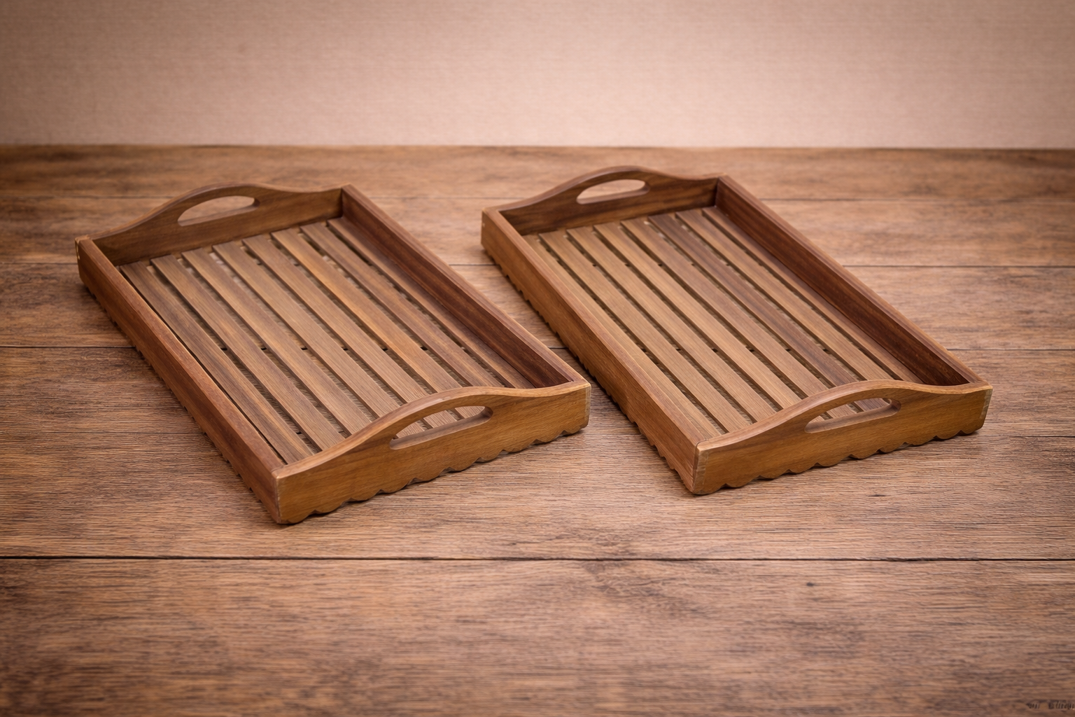 This pair of handcrafted service trays represents a perfect marriage of minimalist geometry and organic warmth. crafted from premium teakwood, each tray features a distinctive slatted base that allows for breathability and a lightweight, airy aesthetic. Stretching to a generous length of 36 cm, these trays are designed as versatile companions for the modern home—ideal for serving refreshments, organizing coffee table essentials, or displaying curated decor.
