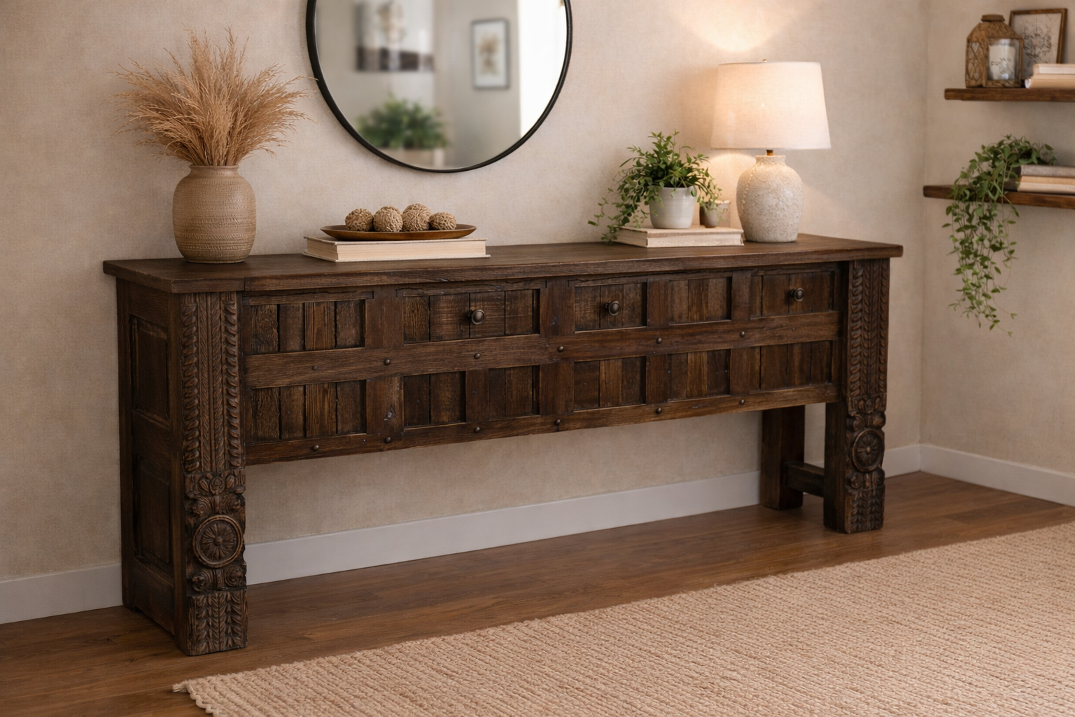 This elongated and stately centerpiece is a handcrafted statement piece, crafted from premium solid timber. Its expansive 169 cm length makes it a perfect anchor for grand entryways, formal seating areas, or as a sophisticated gallery surface for curated treasures. The design features a substantial, thick-cut timber top that beautifully displays a rich, seasoned grain and deep character, finished in a soft luster that radiates warmth.