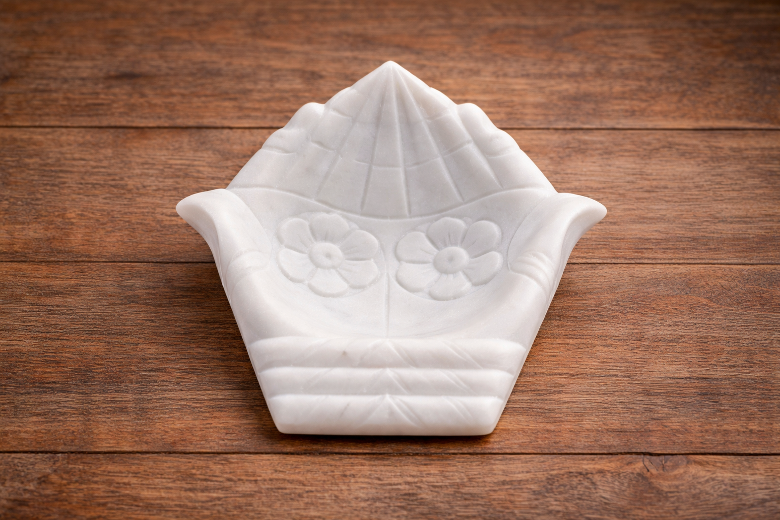 This exquisite ceremonial vessel is a masterwork of delicate stone carving, meticulously shaped from premium white marble into a symbolic offering form. Measuring 9 cm in length, the bowl is sculpted to resemble two cupped palms held in a traditional gesture of greeting and gratitude. It is intricately detailed with hand-etched floral rosettes and geometric linework, making it a profound choice for offering flower petals, sacred ash, or as a sophisticated ring dish for a vanity.