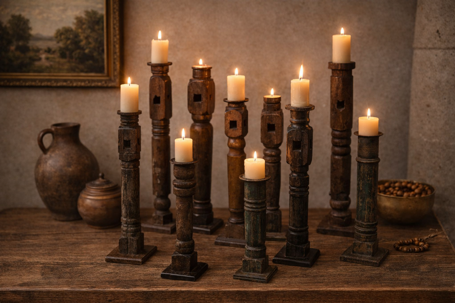 This elegant hand-carved candle stand is a handcrafted statement piece, crafted from premium solid timber. Standing at a functional height of 50 cm, it serves as a sophisticated accent piece for dining tables, mantels, or curated living spaces. The design features a substantial, architectural body that beautifully displays hand-carved, textured surfaces with intricate traditional moldings, finished in a seasoned patina that is finished in a warm, timeworn patina.