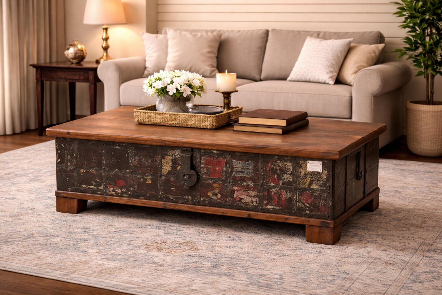 The Chest is secured with a prominent, hand-forged iron hasp and latch, serving as a functional and authentic focal point. Elevated by four thick, square-cut wooden feet, the piece offers a grounded and substantial presence while providing vast internal storage for heirlooms, textiles, or media. Its flat, expansive surface makes it exceptionally versatile, functioning perfectly as a large-scale coffee table that brings a sense of cultural history and handcrafted soul to contemporary living spaces.