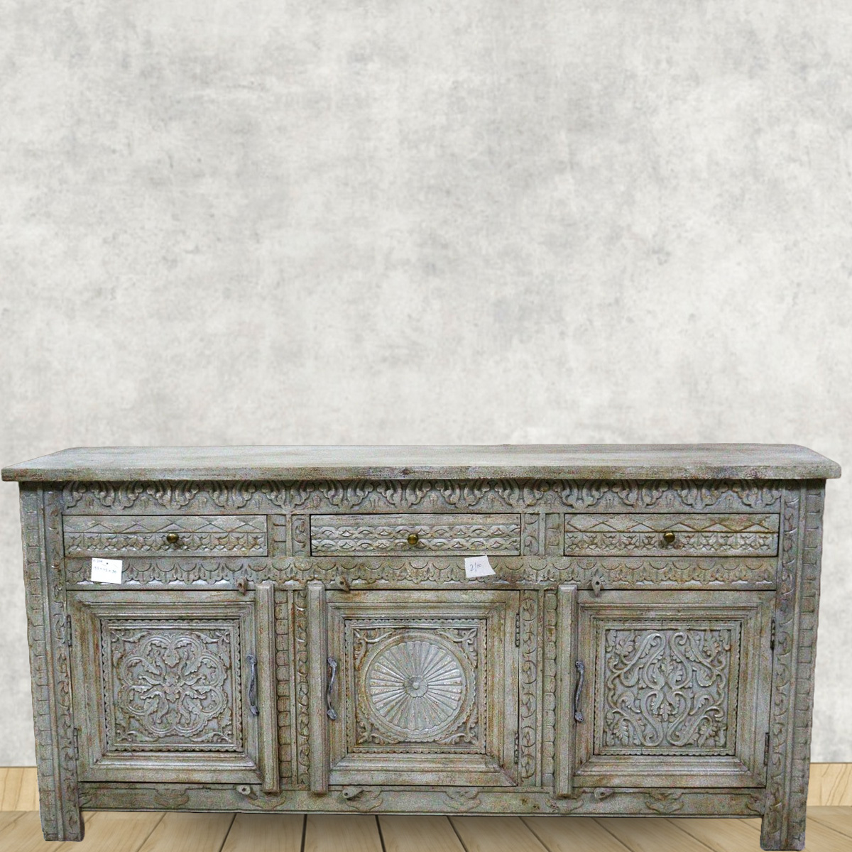 Featuring three spacious drawers and three beautifully paneled cabinets, it offers ample storage for dining essentials, collectibles, or everyday items. The detailed floral and sunburst carvings on the cabinet doors reflect the grandeur of India’s architectural heritage, making it not just a functional piece but a statement of art and history.