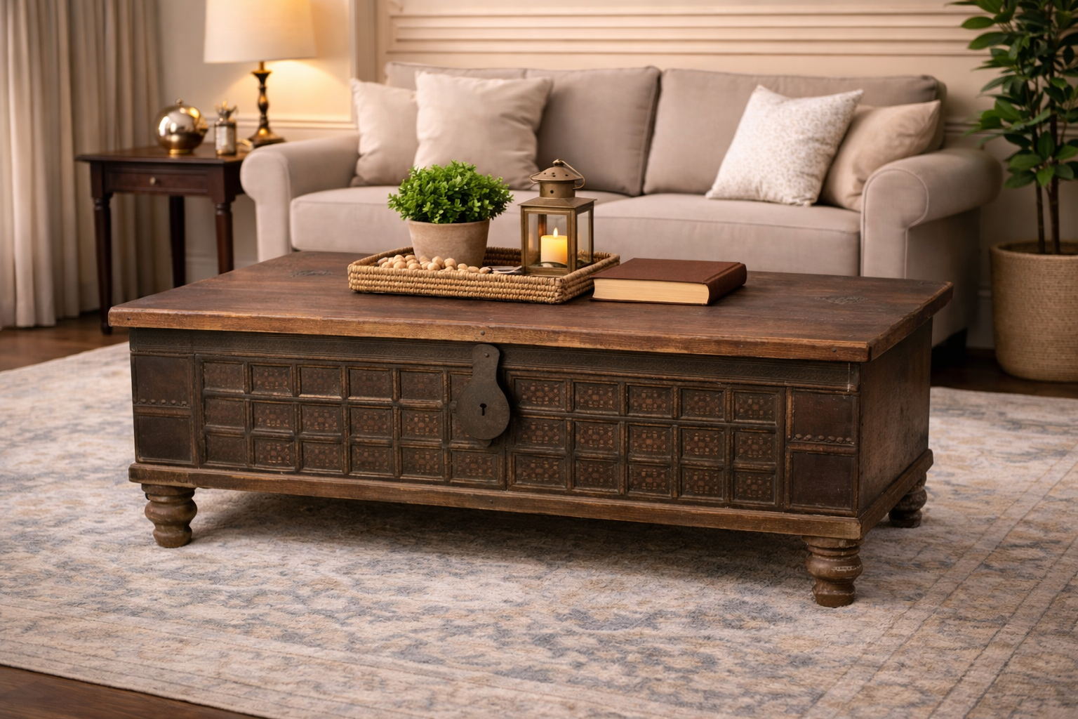 The Chest is secured with a prominent, hand-beaten iron hasp and latch, which serves as an authentic and rugged focal point. It is elevated by four elegantly hand-turned legs, providing an architectural lift that balances its sturdy, low-profile form. With its generous surface area and hidden internal storage capacity, this piece serves as a commanding centerpiece, functioning perfectly as a storied coffee table that brings a sense of cultural history and handcrafted soul to contemporary interiors.
