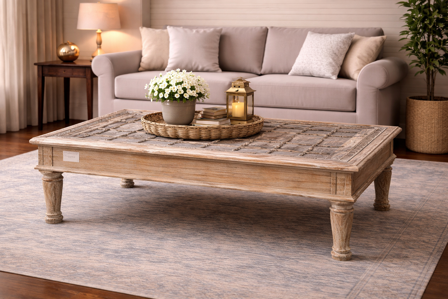 The table is supported by a robust, hand-carved frame featuring traditional joinery and reinforced architectural lines. Its height and proportions provide a sense of grounded permanence, while the natural durability of the timber ensures it serves as a long-lasting centerpiece for the home. Whether used to display oversized art books or as the focal point for social gatherings, this piece seamlessly integrates the soul of heritage design with modern functional living.