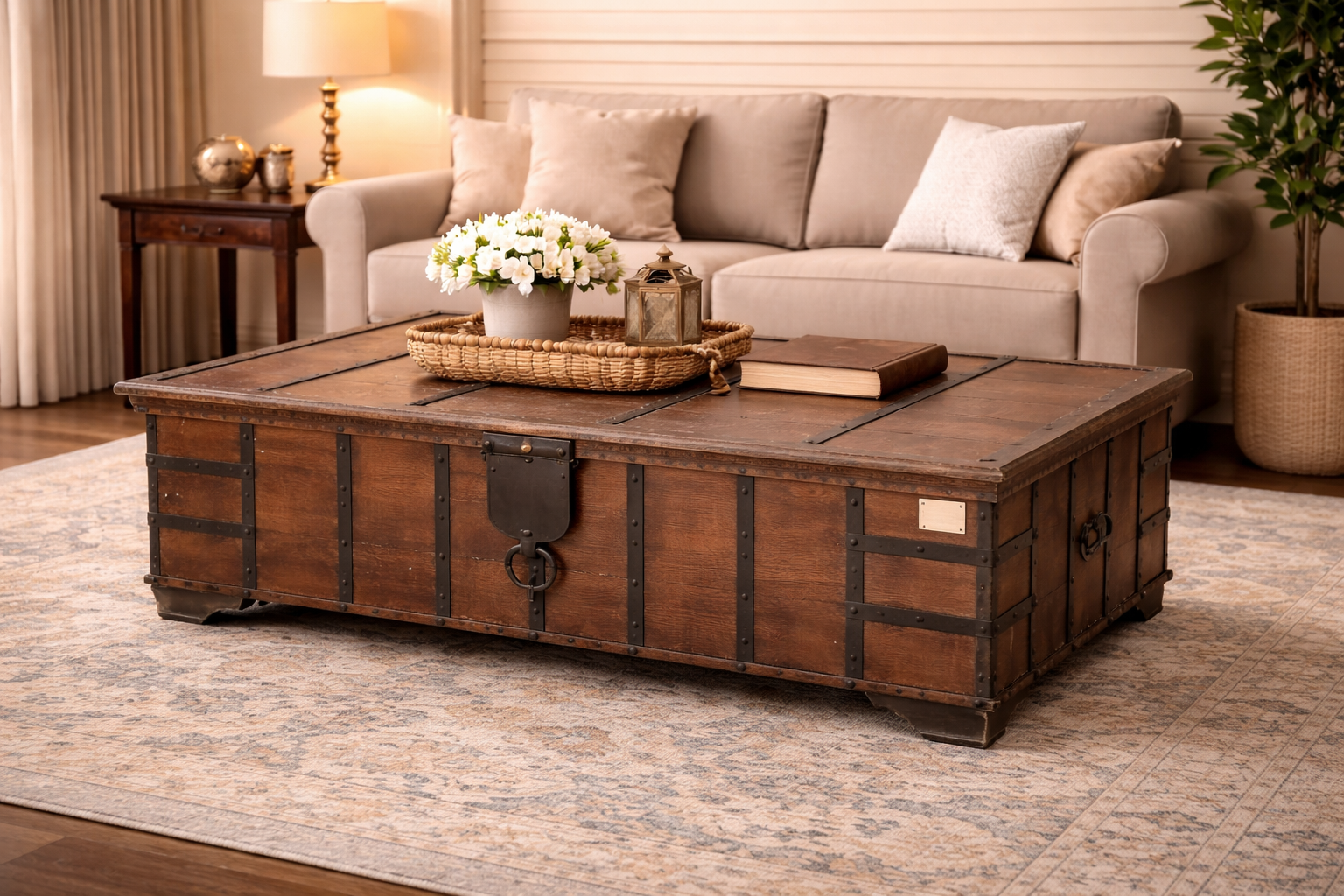 The front of the Chest features a prominent, hand-beaten iron latch and hasp, serving as a powerful visual centerpiece. The top surface is flat and spacious, allowing it to function beautifully as a large-scale coffee table or a statement piece at the foot of a bed. Elevated by low-profile, sturdy bracket feet, this piece maintains a commanding presence while offering immense internal storage for textiles, heirlooms, or media.