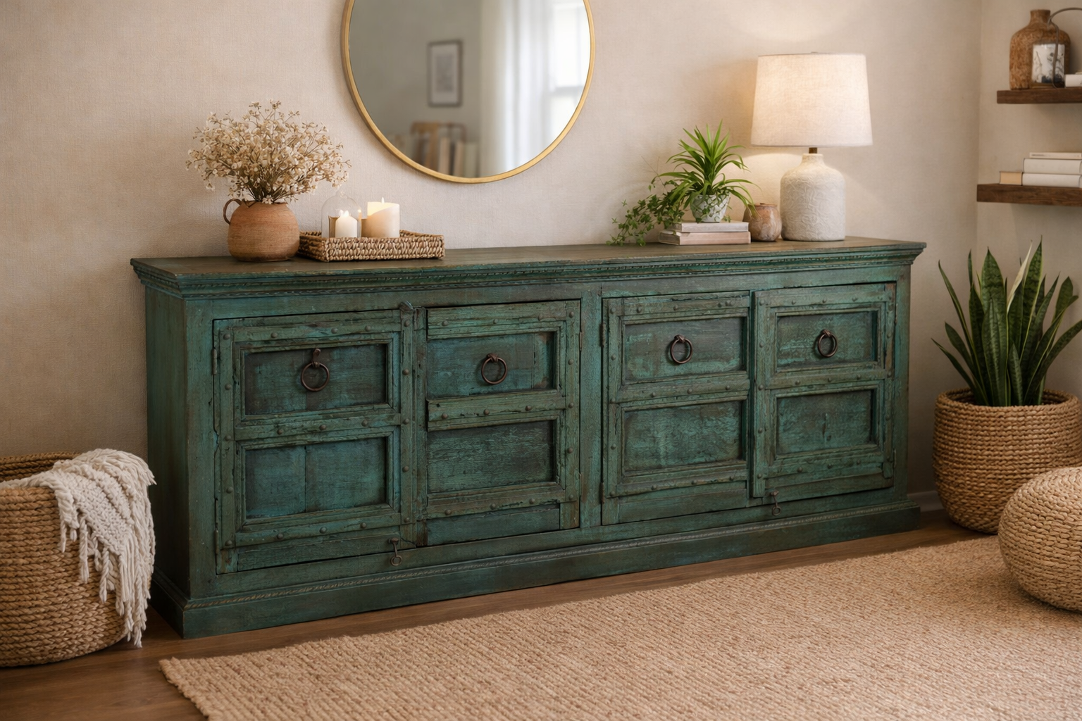 This expansive, four-door architectural statement piece is a masterwork of weathered elegance and heritage craftsmanship. Stretching a grand 225 cm in length, it serves as a commanding anchor for sophisticated dining rooms, expansive hallways, or curated living spaces. The design features a stunning, multi-tonal verdigris patina that evokes the soulful character of reclaimed artifacts, layered over solid timber to reveal a rich, textured history.