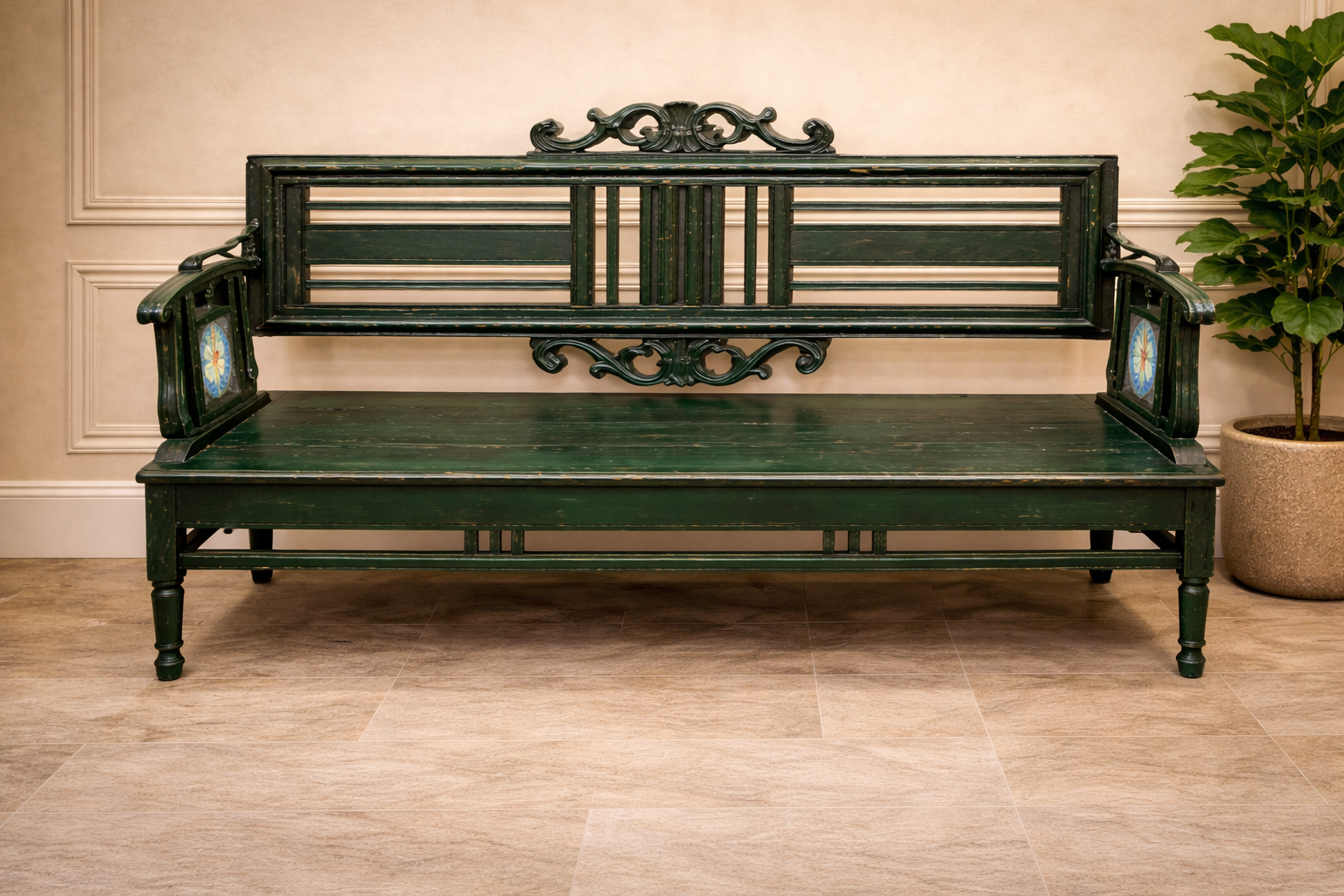 A unique feature of this piece is the integrated side paneling, which includes a decorative tile-style insert, adding a touch of color and refined detail to the armrests. The hand-turned legs provide a regal foundation that elevates the bench’s profile, while the spacious seating area highlights the rich, natural texture of the teak wood beneath the distressed finish. This piece is designed to serve as a welcoming and colorful addition to a foyer, garden gallery, or sunroom.